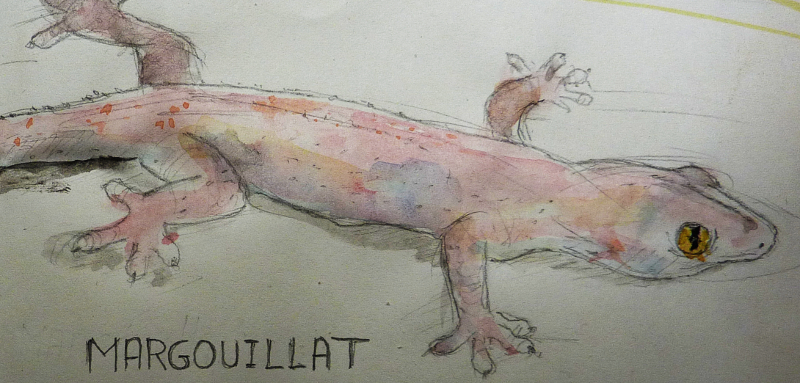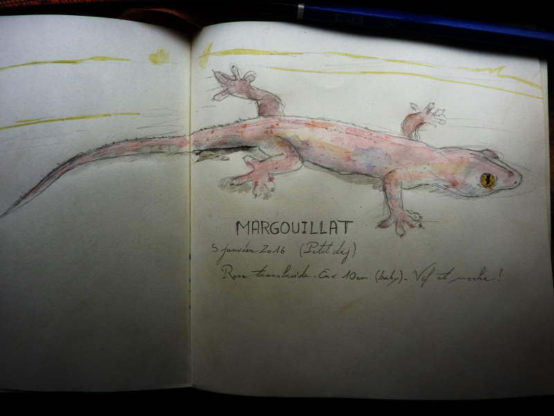 Mardi 05 janvier 2016 12h39 Premier dessin, au petit déjeuner. Un jeune Margouillat. Mignon petit monstre. Véloce la nuit. Carrément amorphe le jour. Bouffeur de moustiques. Compagnon sympathique qui a une fâcheuse tendance à se laisser tomber des plafonds...